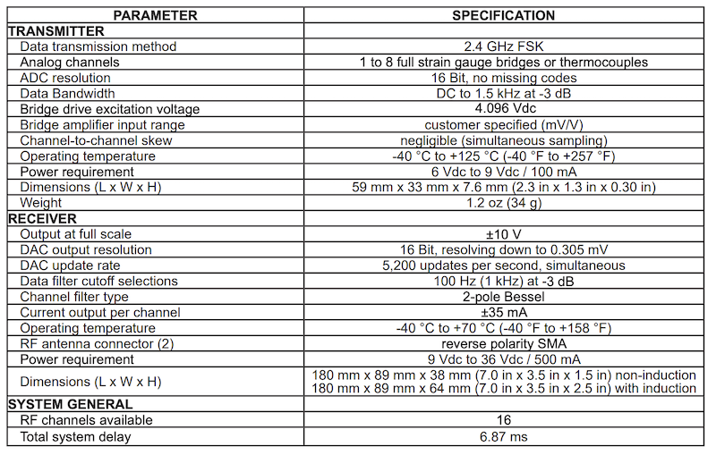 Le récepteur multivoies supporte 16 canaux RF et des mécanismes de contrôle d’erreurs afin d’éviter les pertes et la corruption de données dues aux réflexions ou aux transmissions masquées. Les données de sortie sont fournies sous forme analogique de haut niveau ±10 V pour une interface directe avec la plupart des systèmes d’acquisition de données.